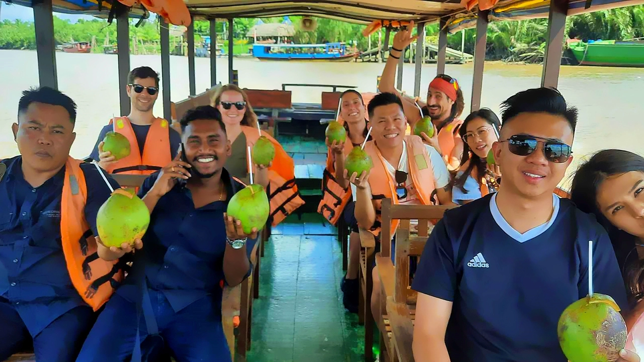 The boat takes you to a small canal, escaping the hustle and bustle of the town. We disembark at a coconut island in Ben Tre and enjoy a walk around the village. Stop at a local family home to enjoy tropical fruit, taste the honey tea and honey wine and listen to Vietnamese traditional music performed by the villagers. Check out the coconut candy shop and learn how to make candy, and see handicrafts made from the coconuts.