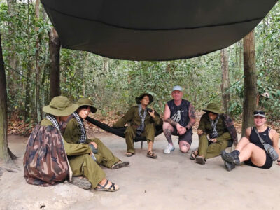 We depart at 8:00 a.m. from Vietnam Adventure Tours office Or pick up at your hotel  to Cu Chi Tunnel for 60km from Ho Chi Minh City. Cu Chi is now considered a heroic district for its role in the anti – American war in Vietnam. It is legendary for its tunnels system of over 220 km and is a popular spot for both Vietnamese and foreigners.